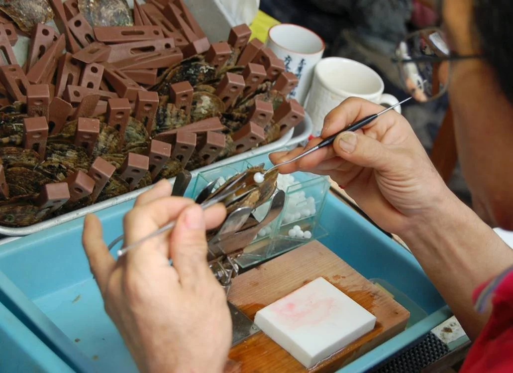 Sorgfältig wird ein hölzerner Keil zwischen die Lippen der Schale gesetzt. Der grosse Moment ist nun gekommen - mit menschlicher Hilfe wird eine Perle gezeugt. Dies ist ein äußerst komplizierter Eingriff, der weltweit nur von wenigen Experten ausgeführt werden kann. Ein kleiner Schnitt wird gemacht und der Salzwasser Auster wird das Mantelgewebe und der Kern implantiert. Der Kern dient als Formgeber, um das sich die Perle entwickelt.